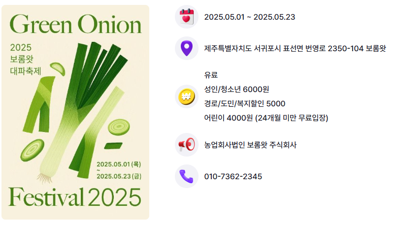 - 운영 시기: 4월 초 ~ 5월 초 (대파꽃 개화 기간과 동일)